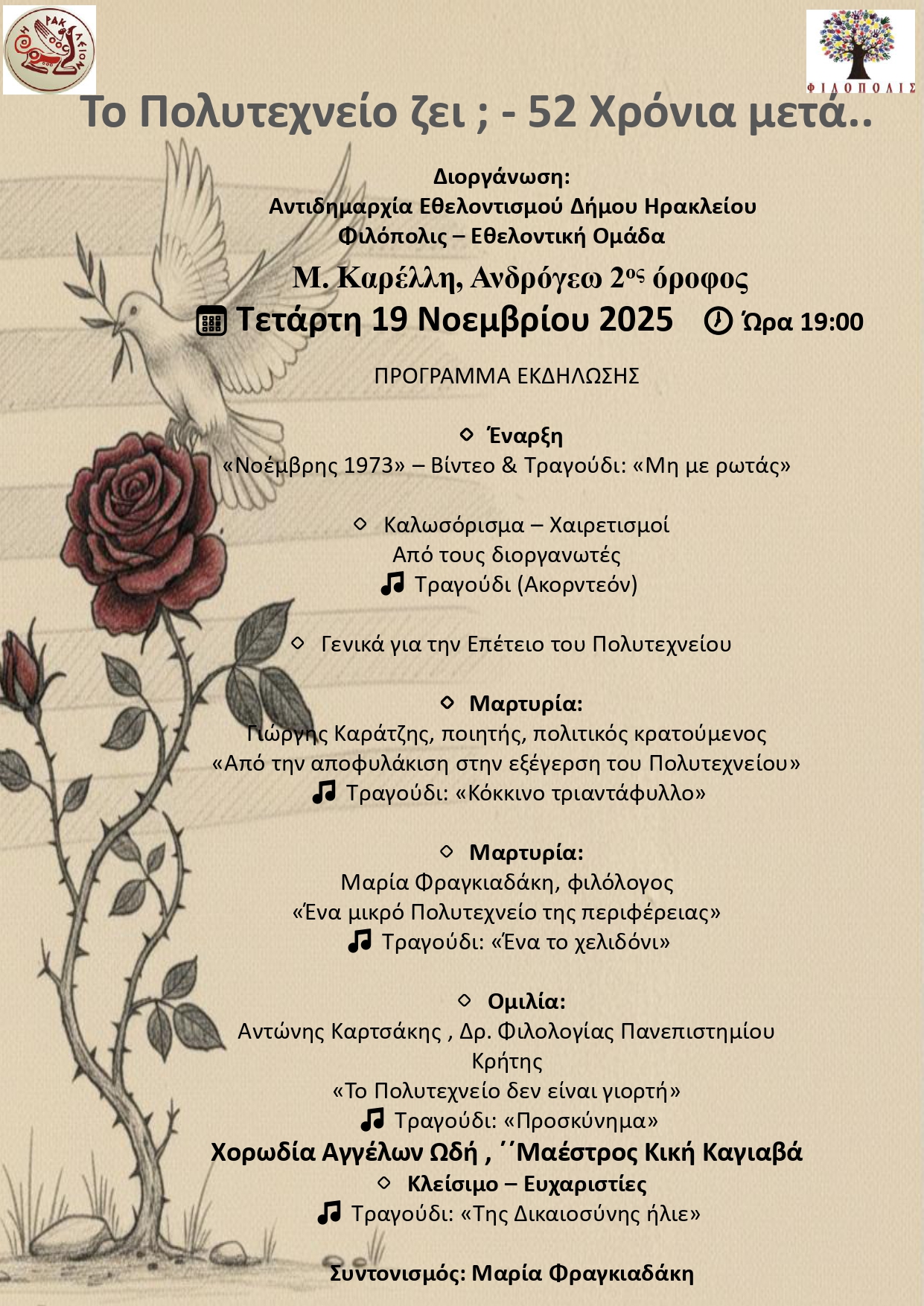 Με αφορμή την επέτειο από την εξέγερση του Πολυτεχνείου στις 17 Νοεμβρίου 1973, ο Δήμος Ηρακλείου-Αντιδημαρχία Εθελοντισμού και η Εθελοντική Ομάδα «Φιλόπολις», διοργανώνουν εκδήλωση με τίτλο «Το Πολυτεχνείο ζει; 52 χρόνια μετά». Η εκδήλωση θα πραγματοποιηθεί  την Τετάρτη 19 Νοεμβρίου 2025 στις  19:00 στην αίθουσα Μ. Καρέλλη, (οδός Ανδρόγεω 2ος όροφος).