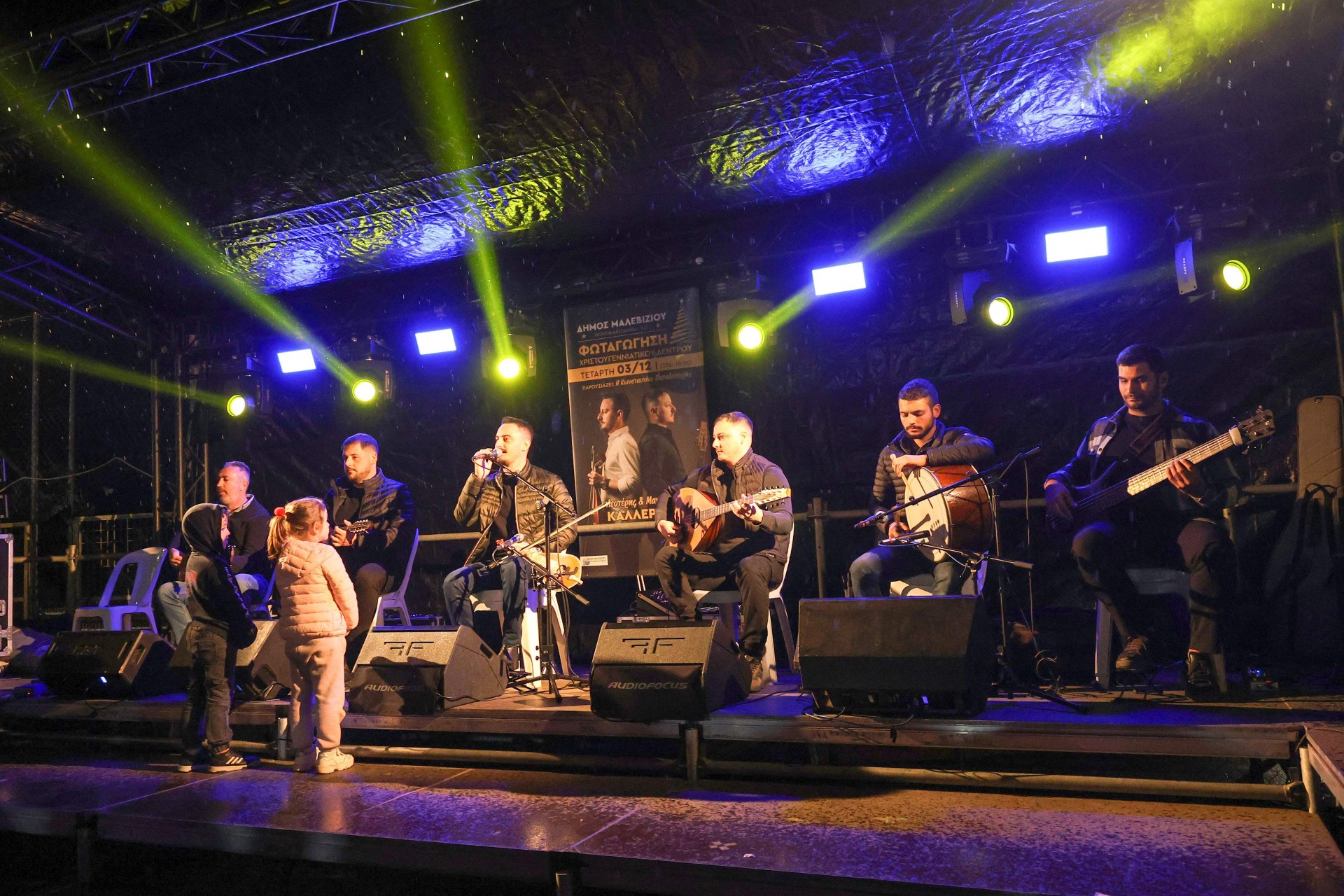 Η εκδήλωση, την οποία παρουσίασε η Κωνσταντίνα Παπαδοπούλου, ξεκίνησε με τη Δημοτική Χορωδία Μαλεβιζίου, που ερμήνευσε κάλαντα από διάφορες περιοχές της Ελλάδας και αγαπημένα χριστουγεννιάτικα τραγούδια, δημιουργώντας μια ζεστή, γιορτινή ατμόσφαιρα. Μετά τη φωταγώγηση, το συγκρότημα των Λευτέρη και Μανούσου Καλλέργη ανέβασε τον ρυθμό και διασκέδασε το κοινό με ζωντανή μουσική.