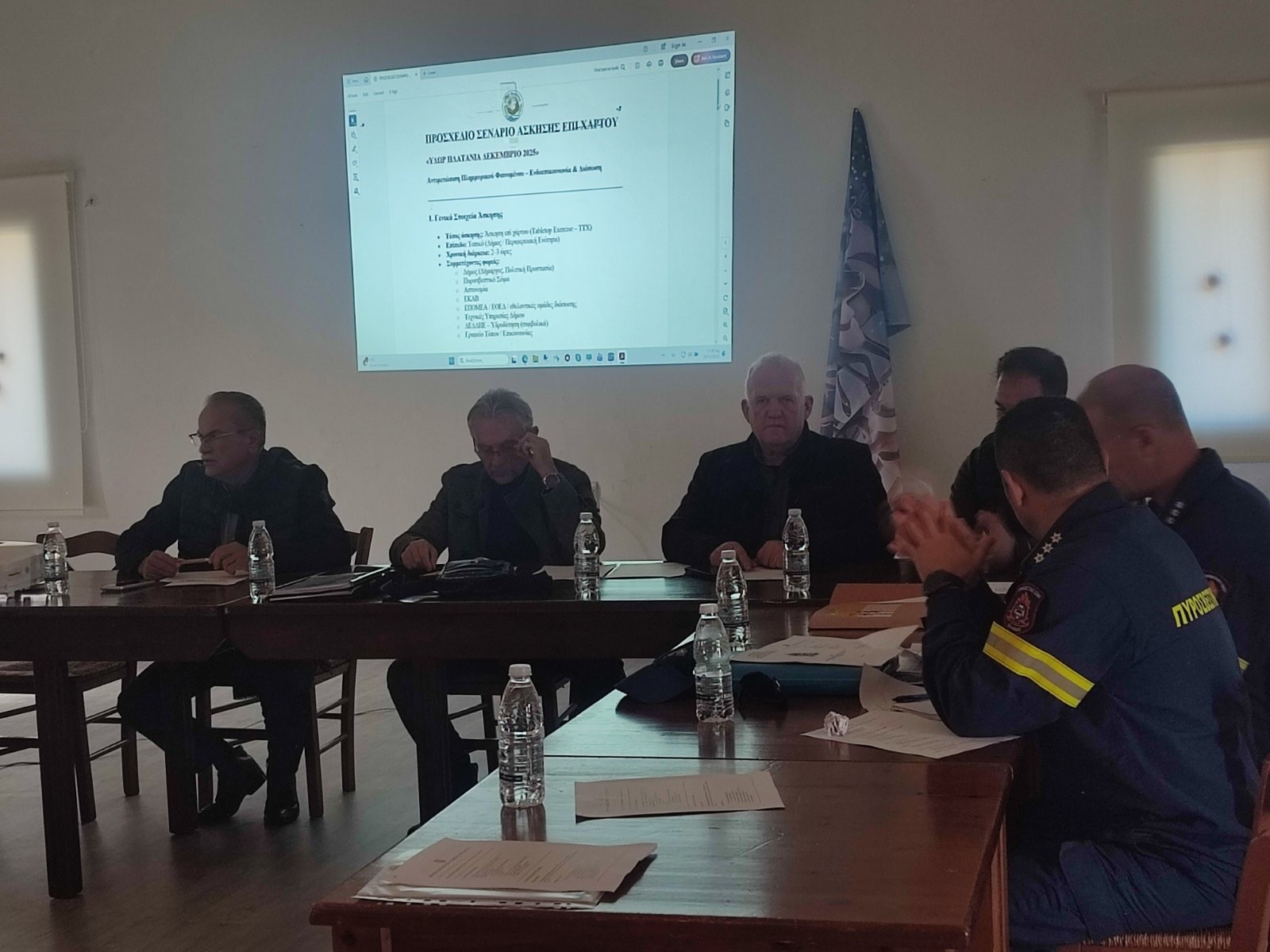Στο πλαίσιο της προετοιμασίας για την αντιμετώπιση κινδύνων από την εκδήλωση πλημμυρικών φαινομένων την χειμερινή περίοδο 2025 -2026, o Δήμος Πλατανιά, πραγματοποίησε «Ασκηση επί χάρτου» με τα μέλη του Συντονιστικού Τοπικού Οργάνου Πολιτικής Προστασίας του Δήμου Πλατανιά (Σ.Τ.Ο.), την Παρασκευή 19 Δεκεμβρίου 2025, στην αίθουσα του πολιτιστικού κέντρου στο Μάλεμε με θέμα: «Σχεδιασμός και διεξαγωγή ασκήσεων Πολιτικής Προστασίας για την αντιμετώπιση κινδύνων από την εκδήλωση πλημμυρικών φαινομένων”.