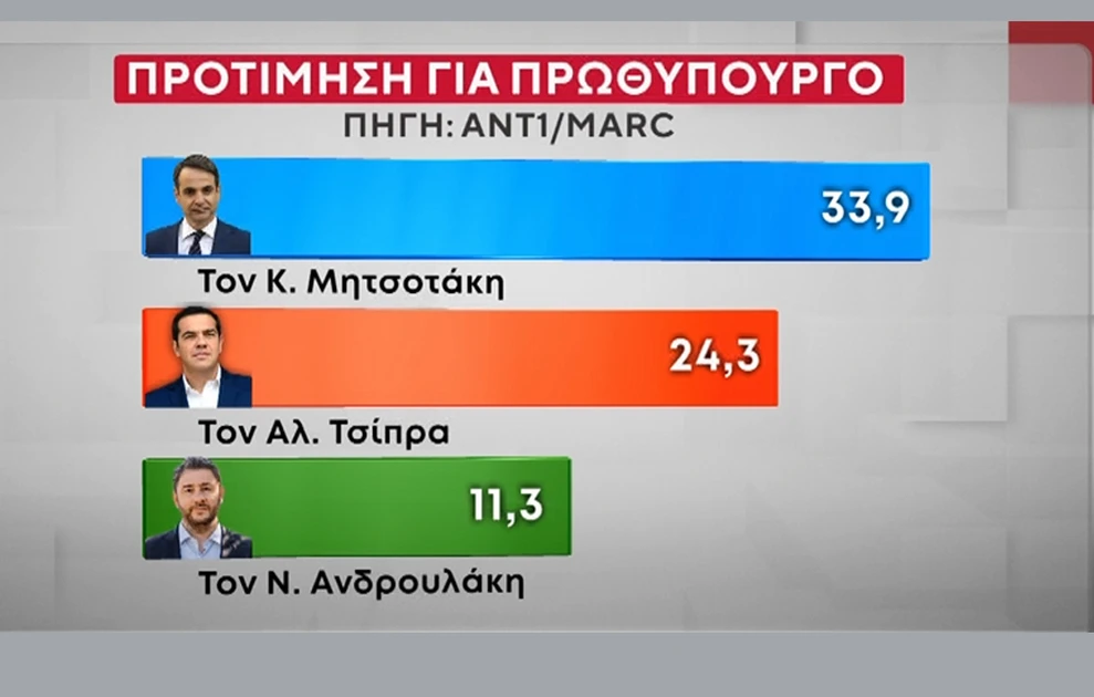 Παράλληλα, η Marc έκανε για πρώτη φορά ερώτημα για την πρωθυπουργία συμπεριλαμβάνοντας τον Αλέξη Τσίπρα, ο οποίος λαμβάνει 24,3%, δηλαδή 9,6 μονάδες χαμηλότερα από τον Κυριάκο Μητσοτάκη, ο οποίος λαμβάνει 33,9%, με τον Νίκο Ανδρουλάκη στο 11,3%.