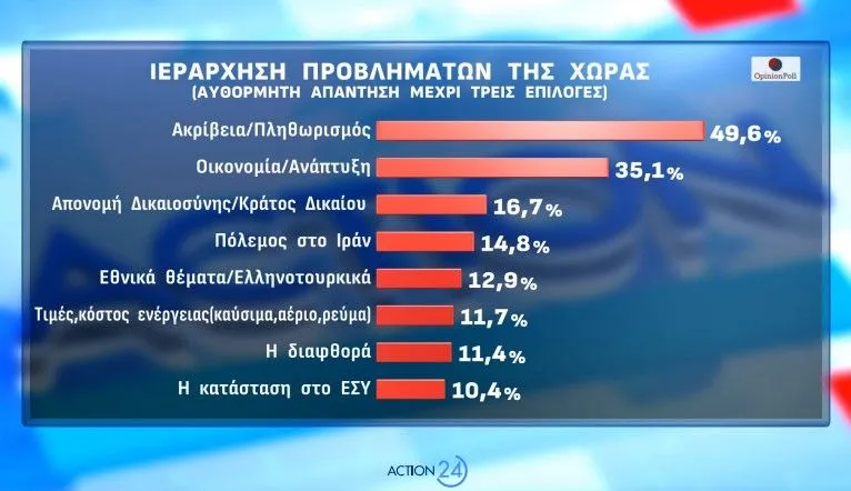 Σε ό,τι αφορά την ιεράρχηση προβλημάτων της χώρας, η πλειοψηφία των πολιτών έθεσε την ακρίβεια ως το μεγαλύτερο πρόβλημα και μάλιστα, με ποσοστά 49,6%.