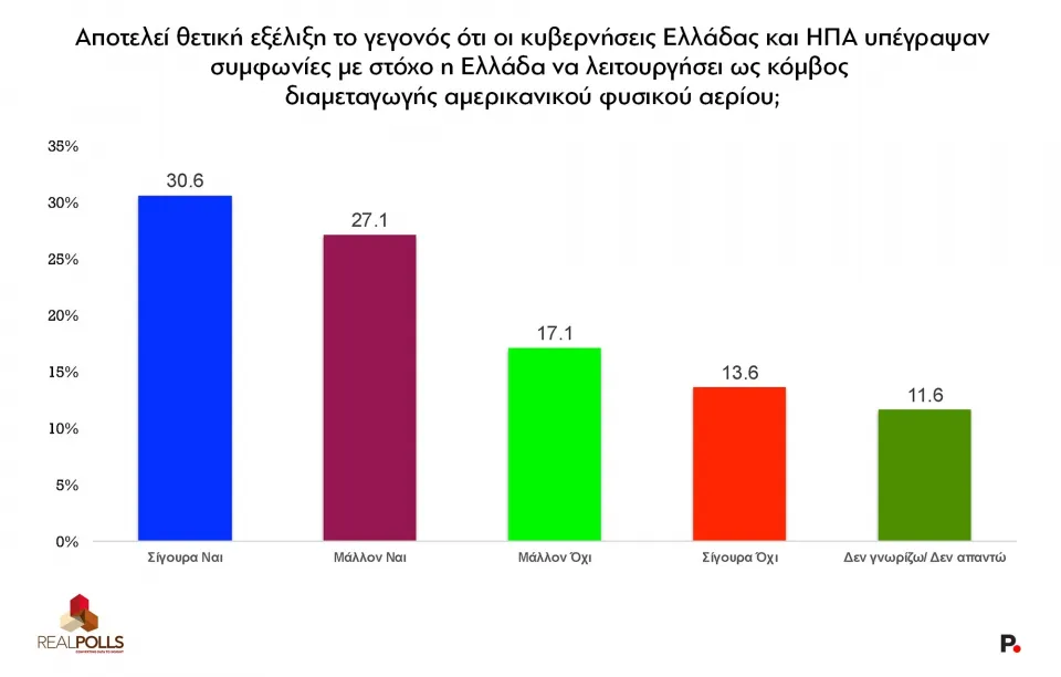 Ως προς τις συμφωνίες ώστε η Ελλάδα να λειτουργήσει ως κόμβος διαμεταγωγής του αμερικανικού LNG, το 57,7% (30,6% «σίγουρα ναι» και 27,1% «μάλλον ναι») τις αξιολογούν θετικά.
