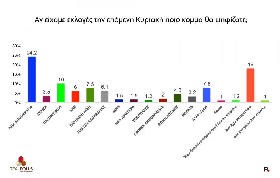 Αναλυτικότερα, στην πρόθεση ψήφου, η Νέα Δημοκρατία συγκεντρώνει ποσοστό 24,2%, το ΠΑΣΟΚ ακολουθεί με 10%, ενώ στην τρίτη θέση βρίσκεται η Ελληνική Λύση με 7,5%.