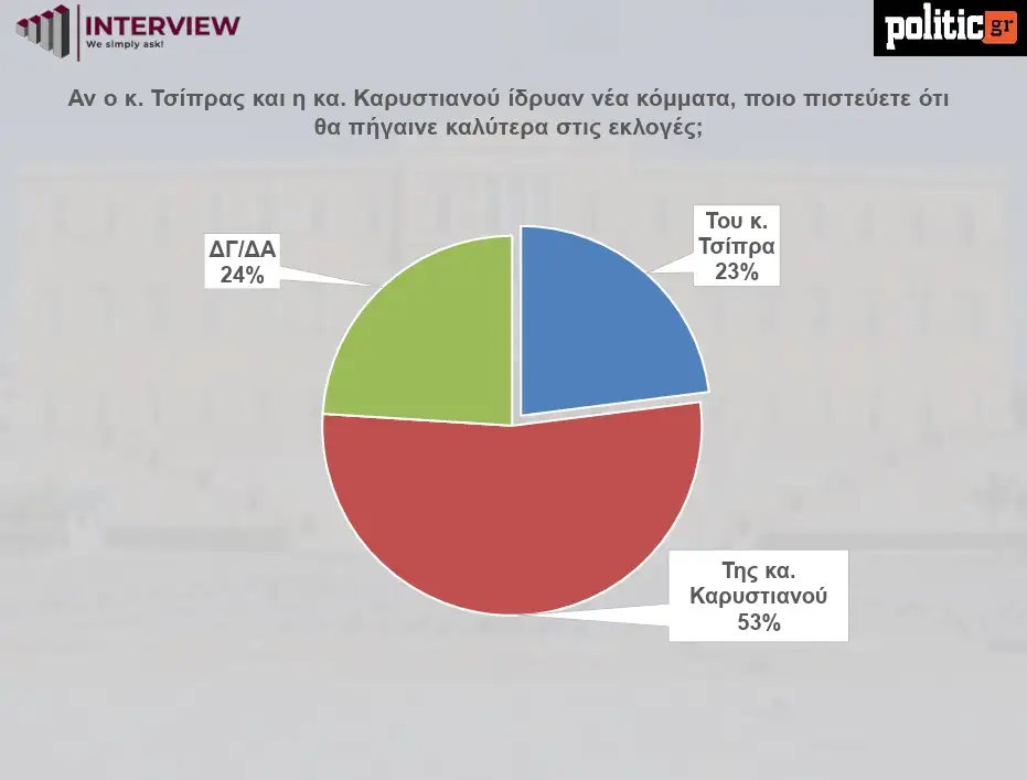 Τα αποτελέσματα έδειξαν πως το υποθετικό κόμμα της Μαρίας Καρυστιανού συγκεντρώνει 53%, υπερδιπλάσιο ποσοστό σε σχέση με το 23% που αποδίδεται στο αντίστοιχο του Αλέξη Τσίπρα.