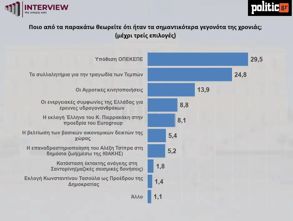 Η υπόθεση ΟΠΕΚΕΠΕ και τα συλλαλητήρια για την τραγωδία των Τεμπών αναδεικνύονται ως τα σημαντικότερα γεγονότα της χρονιάς, καταλαμβάνοντας τις 2 πρώτες θέσεις με συνολικό ποσοστό άνω του 50%.