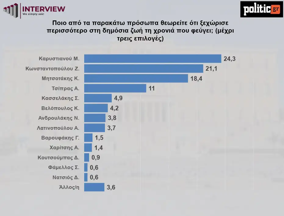 Η Μαρία Καρυστιανού καταγράφει το υψηλότερο ποσοστό (24,3%) μεταξύ των προσώπων που ξεχώρισαν περισσότερο στη δημόσια ζωή τη χρονιά που φεύγει. Στη δεύτερη θέση ακολουθεί η Ζωή Κωνσταντοπούλου (21,1%), επιβεβαιώνοντας τη σταθερή θέση της στον δημόσιο πολιτικό διάλογο.
