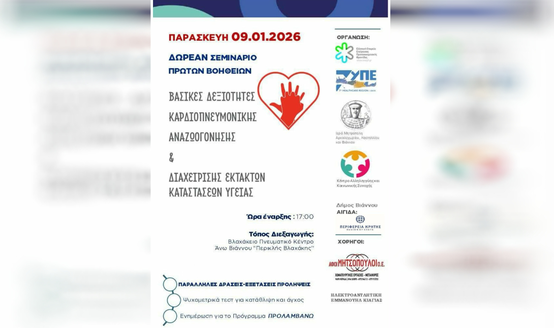 Ένα δωρεάν σεμινάριο Πρώτων Βοηθειών με θέμα: «Βασικές δεξιότητες καρδιοπνευμονικής αναζωογόνησης και διαχείρισης έκτακτων καταστάσεων υγείας» θα πραγματοποιηθεί στον Δήμο Βιάννου.