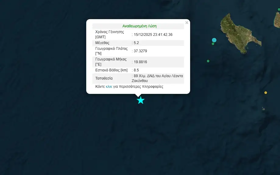 Σεισμός μεγέθους 5,2 βαθμών της κλίμακας Ρίχτερ – σύμφωνα με την αναθεωρημένη λύση του Γεωδυναμικού Ινστιτούτου του Εθνικού Αστεροσκοπείου Αθηνών – σημειώθηκε ανατολικά από τη Ζάκυνθο στη 01:41 τα ξημερώματα της Τρίτης (16.12.2025).