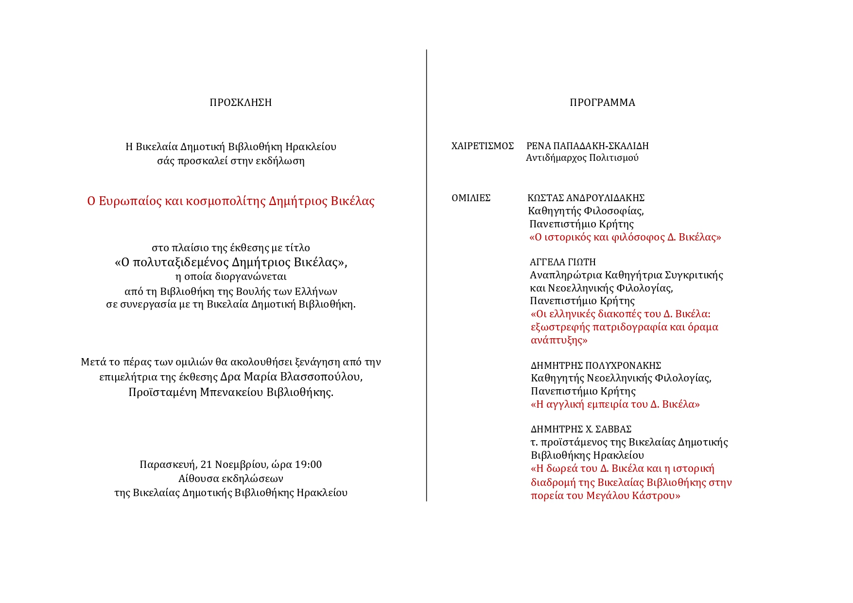 • Δημήτρης Χ. Σάββας, τ. προϊστάμενος της Βικελαίας Δημοτικής Βιβλιοθήκης Ηρακλείου, «Η δωρεά του Δ. Βικέλα και η ιστορική διαδρομή της Βικελαίας Βιβλιοθήκης στην πορεία του Μεγάλου Κάστρου»