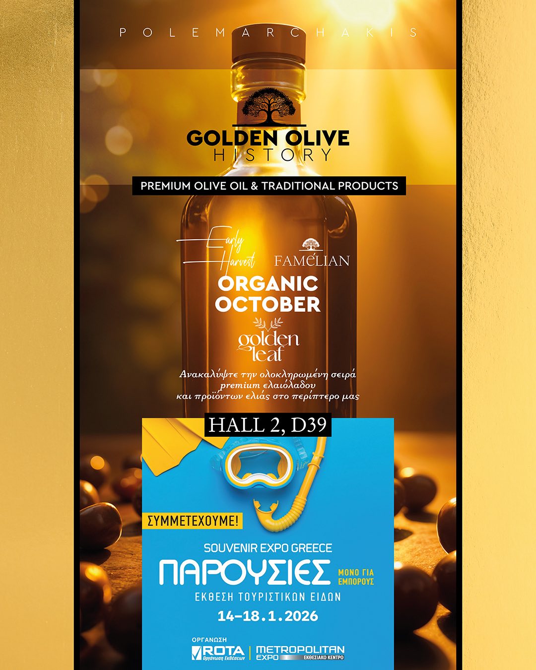 Η εταιρεία προσκαλεί επαγγελματίες και συνεργάτες να επισκεφθούν το περίπτερό της στη Metropolitan Expo, Hall 2 | D39 και να ανακαλύψουν την ολοκληρωμένη premium σειρά ελαιολάδου της Golden Olive History και όλες τις ποικιλίες ελαιολάδου από κοντά!
