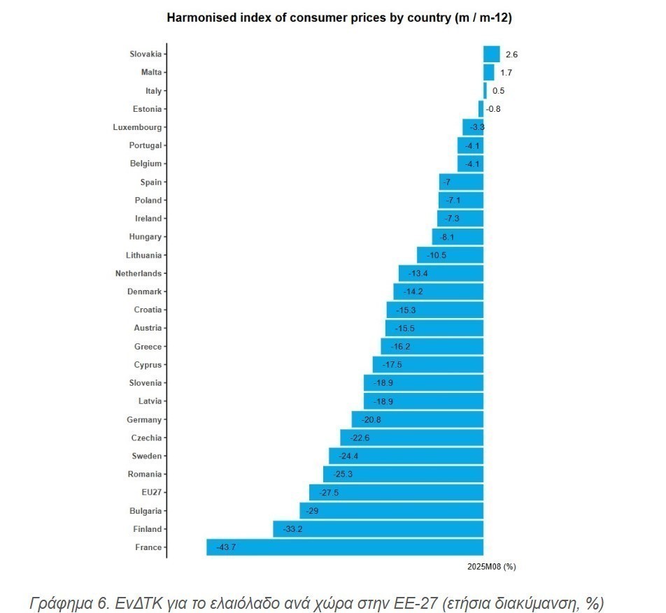 Ο Εναρμονισμένος Δείκτης Τιμών Καταναλωτή (ΕνΔΤΚ) για το ελαιόλαδο στην ΕΕ μειώθηκε κατά 27,5% τον Αύγουστο του 2025 σε σύγκριση με τον ίδιο μήνα του προηγούμενου έτους, σημειώνοντας ελαφρώς μικρότερη πτώση από ό,τι τον Ιούλιο (-1,4% σε μηνιαία βάση). Ο δείκτης παρουσιάζει πτωτική τάση από τον Απρίλιο του 2024 . Οι μεγαλύτερες μειώσεις καταγράφηκαν στη Γαλλία, τη Φινλανδία και τη Βουλγαρία.