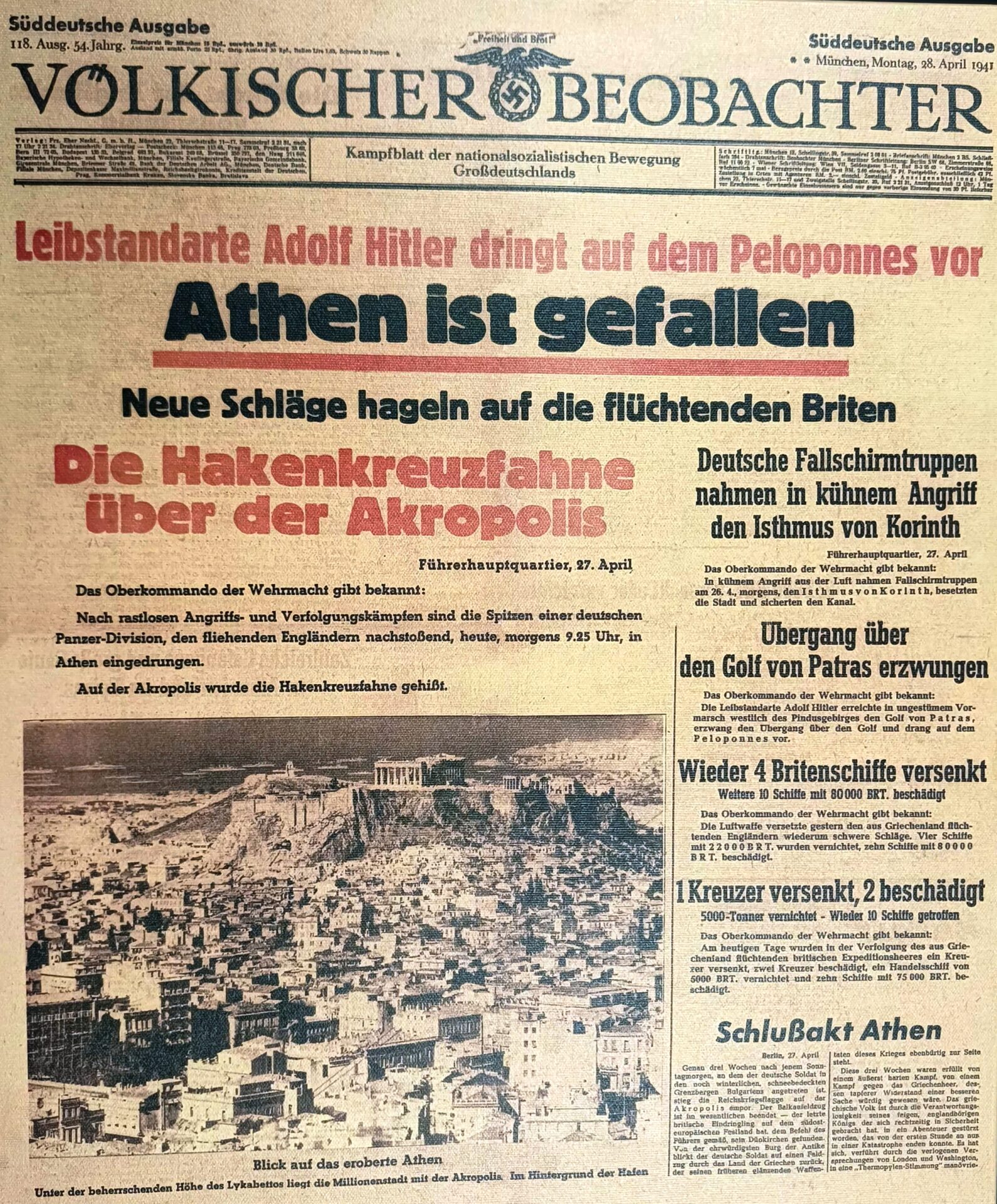 - Πρόκειται για το μοναδικό σωζόμενο φύλλο της εφημερίδας Volkischer Beobachter που περιγράφει την εισβολή των γερμανικών στρατευμάτων στην Αθήνα το 1941.