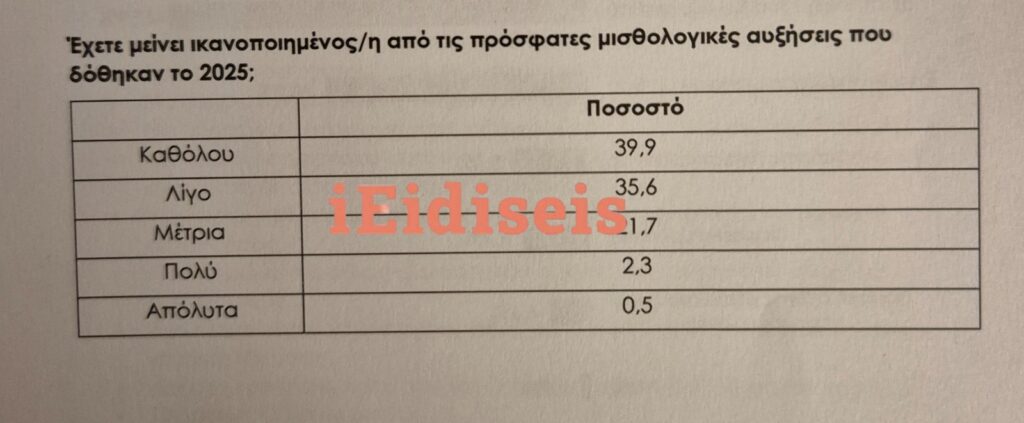 Στην ερώτηση εάν είναι ευχαριστημένοι από τις πρόσφατες μισθολογικές αυξήσεις που δόθηκαν από την κυβέρνηση, το 40% απάντησε καθόλου, το 35,6% απάντησε λίγο, το 21% μέτρια, το 2,3% απάντησε πολύ και το 0,5% απόλυτα.