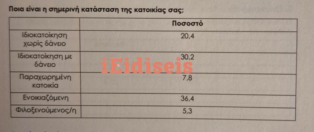 Μόνο το 20% απάντησε ότι ιδιοκατοικεί χωρίς δάνειο. Το 36,5% νοικιάζει σπίτι, το 30% έχει στεγαστικό δάνειο, ένα 8% διαμένει σε οικία που του έχει παραχωρηθεί και το 5% φιλοξενείται.