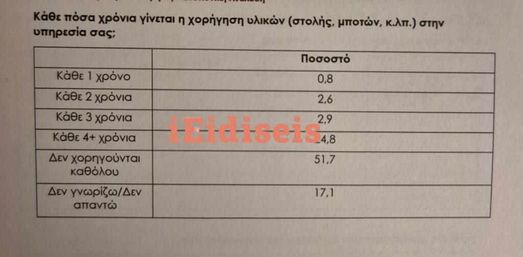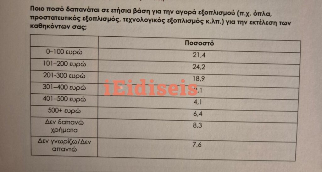 Στην ερώτηση κάθε πόσα χρόνια χορηγούνται υλικά (στολές, μπότες κλπ), το 50% απάντησε ότι δεν χορηγούνται καθόλου και ότι τα υλικά που υπάρχουν δεν ανταποκρίνονται στις σύγχρονες ανάγκες και τις απαιτήσεις της υπηρεσίας. Ένα 68% απάντησε επίσης ότι δαπανά ετησίως έως 300 ευρώ για αγορά εξοπλισμού (όπλα, προστατευτικός εξοπλισμός κλπ).