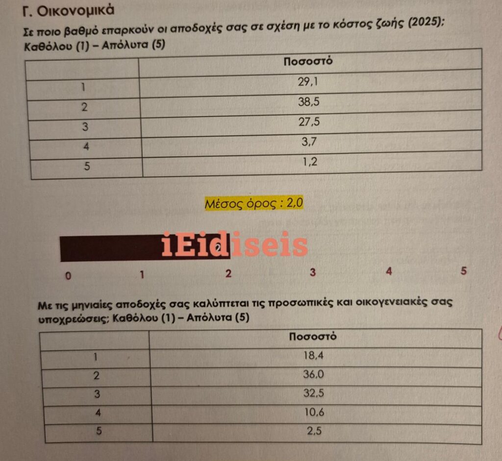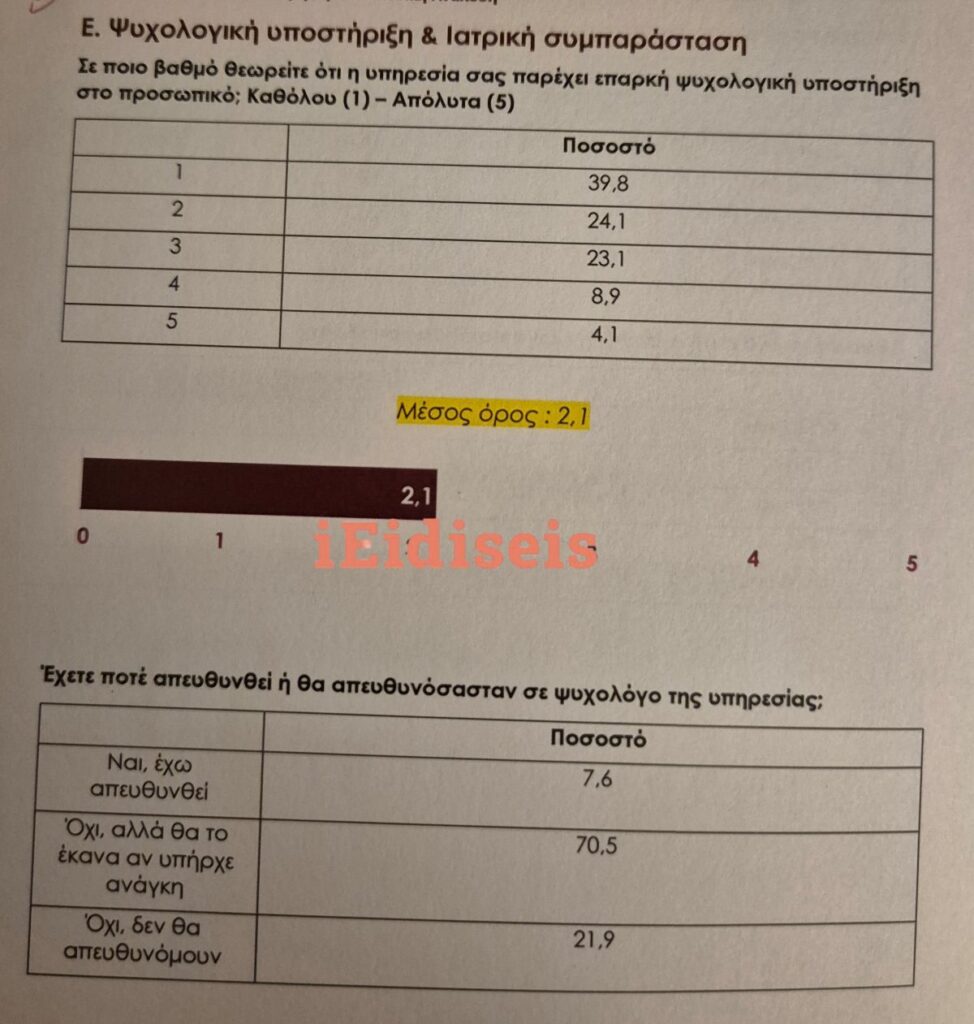 7 στους 10 αστυνομικούς δεν τα βγάζουν πέρα οικονομικά, 1 στους 2 δεν μπορεί να καλύψει τις οικογενειακές του υποχρεώσεις, 4 στους 5 αντιμετωπίζουν στεγαστικό πρόβλημα, 1 στους 3 δεν εμπιστεύεται τη διοίκηση της υπηρεσίας του, 6 στους 10 δεν θεωρεί επαρκή την ψυχολογική υποστήριξη που του παρέχεται και 9 στους 10 δεν έχει απευθυνθεί ποτέ σε ψυχολόγο της ΕΛ.ΑΣ.
