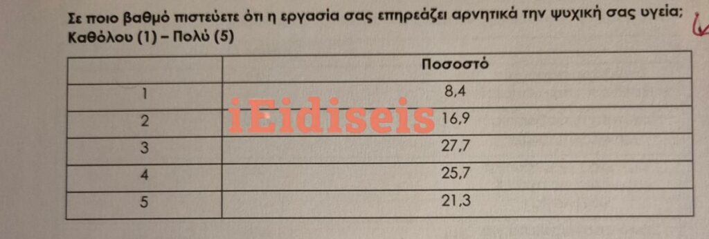 Ένα άλλο στοιχείο της έρευνας που προκαλεί ανησυχία αφορά στη ψυχολογία των αστυνομικών. Σχεδόν το 50% των ερωτηθέντων απάντησαν ότι η εργασία τους επηρεάζει αρνητικά τη ψυχική τους υγεία. Οι αστυνομικοί θεωρούν -σε ποσοστό άνω του 60% – ότι δεν τους παρέχεται επαρκής ψυχολογική υποστήριξη, ενώ στη συντριπτική πλειονότητά τους δεν έχουν απευθυνθεί ποτέ στους ψυχολόγους της ΕΛ.ΑΣ.