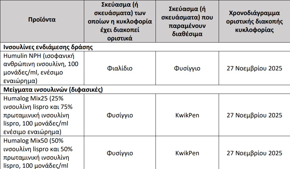 Υπογραμμίζει πως η ΦΑΡΜΑΣΕΡΒ ΛΙΛΛΥ Α.Ε.Β.Ε. έχει ήδη προχωρήσει στην οριστική διακοπή κυκλοφορίας των παρακάτω σκευασμάτων ινσουλίνης στην Ελλάδα.