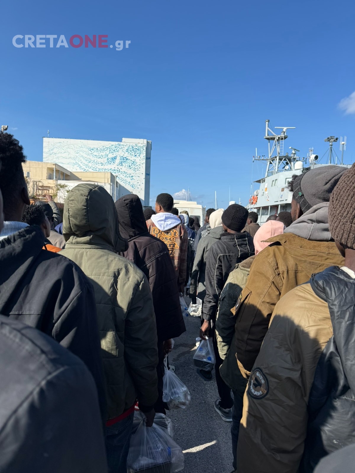 Οι μετανάστες αναχωρούν από το λιμάνι του Ηρακλείου με πλωτό σκάφος του Λιμενικού Σώματος και, σύμφωνα με πληροφορίες, προορισμός τους είναι δομές στη νησιωτική Ελλάδα.
