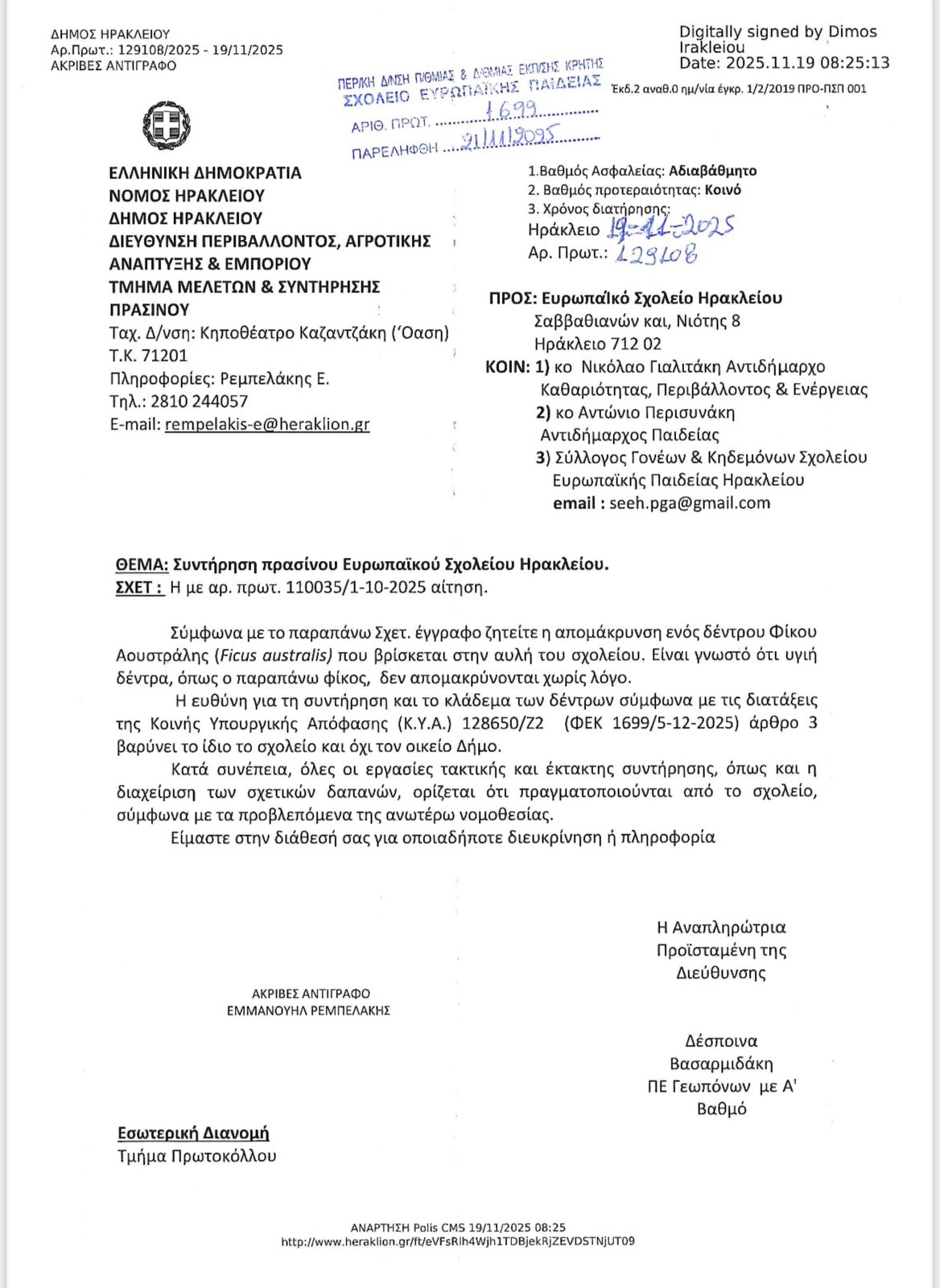 Διοικητικό λάθος ολκής που δημιουργεί ερωτήματα για τη λειτουργία και την αξιοπιστία των υπηρεσιών του Δήμου Ηρακλείου αποκαλύφθηκε μετά από επίσημο αίτημα του Συλλόγου Γονέων προς το Τμήμα Πρασίνου για τον έλεγχο μεγάλου δέντρου στην αυλή του Ευρωπαϊκού Σχολείου Ηρακλείου.
