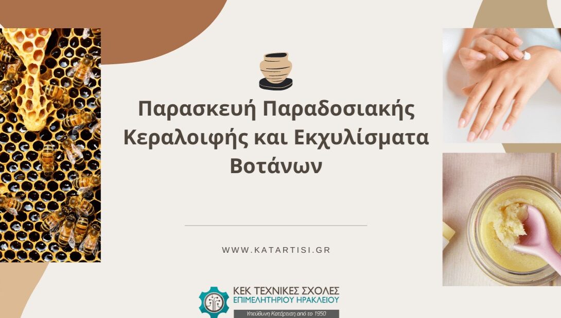 Απευθύνεται: Σε όσους επιθυμούν να μάθουν να φτιάχνουν τη δική τους κεραλοιφή αλλά και σε όσους ασχολούνται με την μελισσοκομεία θέλουν να επεξεργαστούν τα μελισσοκομικά προϊόντα
