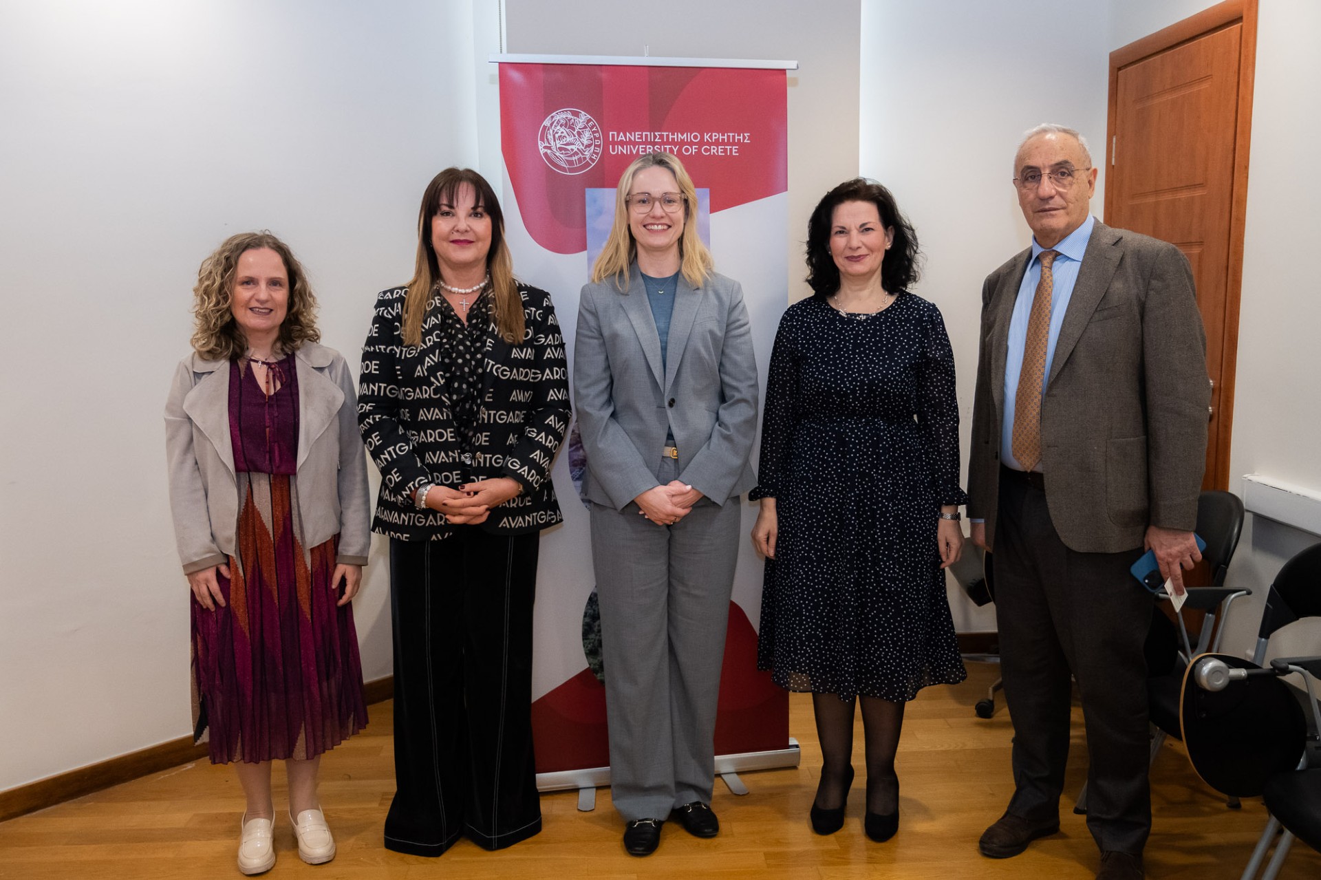 Τους επισκέπτες υποδέχθηκε, εκ μέρους του Πρύτανη του Πανεπιστημίου Κρήτης καθηγητή Γεώργιου Μ. Κοντάκη, η Αντιπρύτανις Διοικητικών Υποθέσεων και Φοιτητικής Μέριμνας, καθηγήτρια Σοφία Σχίζα.