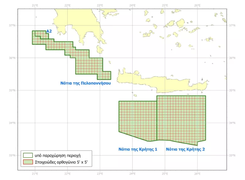 Ο διεθνής διαγωνισμός που ολοκληρώθηκε στις 10 Σεπτεμβρίου και ξεκίνησε στις 12 Ιουνίου με τη δημοσίευση της προκήρυξης στην Εφημερίδα της Ε.Ε, αφορούσε συγκεκριμένα τις περιοχές «Μπλοκ Α2», «Νότια της Πελοποννήσου», «Νότια της Κρήτης 1» και «Νότια της Κρήτης 2», συνολικής έκτασης 47 χιλιάδων τετραγωνικών χιλιομέτρων. Πιο συγκεκριμένα, περιλαμβάνει τα οικόπεδα «Νότια της Κρήτης Ι» και «Νότια της Κρήτης ΙΙ» περιοχές συνολικής έκτασης 35.000 τ. χλμ., «Ν. Πελοπόννησος», ζώνη έκτασης 11.000 τ.χλμ. και «Α2» νότια της Πελοποννήσου, έκτασης 826 τ. χλμ..