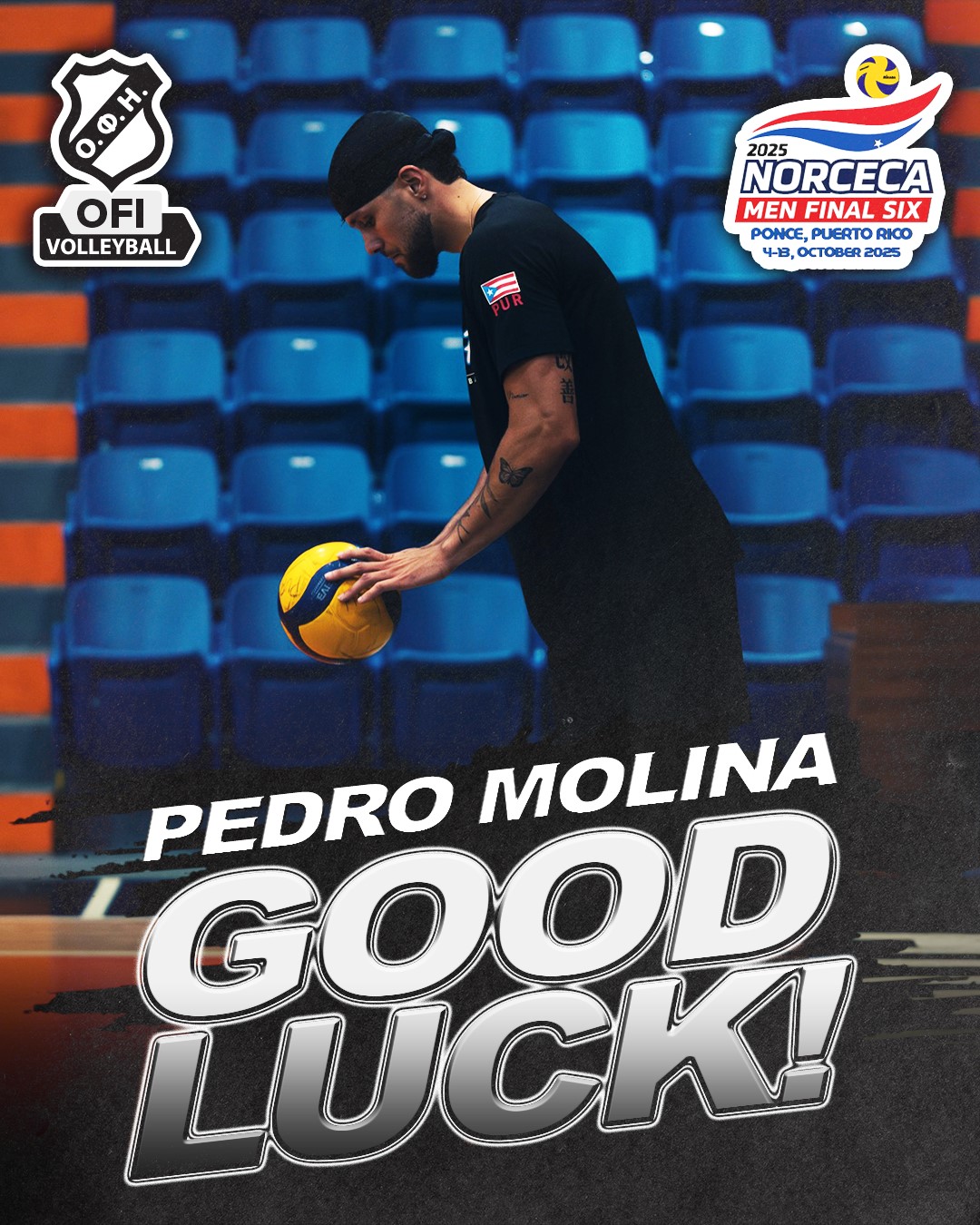 Ο διεθνής ακραίος της ομάδας βόλεϊ του Ερασιτέχνη ΟΦΗ Πέδρο Μολίνα, αναχώρησε για το Πουέρτο Ρίκο προκειμένου να αγωνιστεί με την Εθνική ομάδα της χώρας του, της οποίας είναι και αρχηγός, στο NORCECA Men’s Final Six, που διεξάγεται στην πόλη Πόνσε του Πουέρτο Ρίκο, από 4-13 Οκτωβρίου.