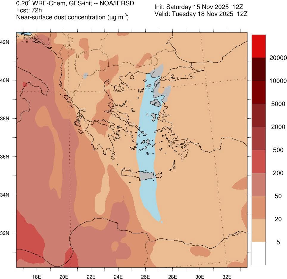 Έρχεται ξανά από αύριο Δευτέρα 17/11 η Αφρικανική σκόνη και οι νοτιάδες στην Κρήτη, με το σκηνικό του καιρού να συμπληρώνεται από λίγες βροχές και ήπιες-για την εποχή-θερμοκρασίες.