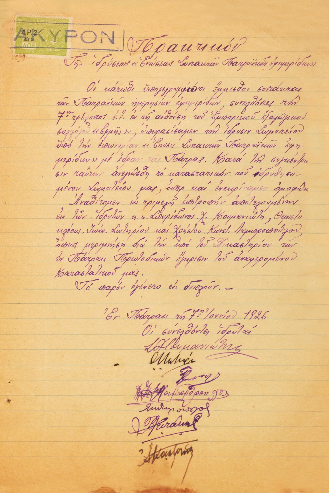 Χρονιά – σταθμός αποτέλεσε το 1926, οπότε συγκροτήθηκε η «Ένωσις Συντακτών Πατραϊκών Εφημερίδων». Πρόεδρος στο πρώτο Διοικητικό Συμβούλιο ήταν ο Σπύρος Κουμανιώτης, γραμματέας ο Θέμης Σωτηρίου και ταμίας ο Χρήστος Λαμπρόπουλος, ως ταμίας.