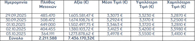 Η «Eurobank Ergasias Υπηρεσιών και Συμμετοχών Ανώνυμη Εταιρεία» («Eurobank Holdings»), σε συνέχεια της από 07.05.2025 ανακοίνωσής της σχετικά με την έναρξη εφαρμογής του Προγράμματος Επαναγοράς Ιδίων Μετοχών («Πρόγραμμα»), που εγκρίθηκε με την απόφαση της Τακτικής Γενικής Συνέλευσης των Μετόχων της Eurobank Holdings στις 30.04.2025 και σε συνέχεια της από 30.04.2025 απόφασης του Διοικητικού Συμβουλίου της, ενημερώνει το κοινό ότι κατά το διάστημα 29/09/2025 – 03/10/2025 απέκτησε συνολικά, στο πλαίσιο του Προγράμματος, 2.211.588 μετοχές εκδόσεως της ιδίας («Ίδιες Μετοχές») που διαπραγματεύονται στο Χρηματιστήριο Αθηνών («Χ.Α.»), με μέση τιμή κτήσης €3,3624, ανά μετοχή και συνολικό κόστος €7.436.170,32