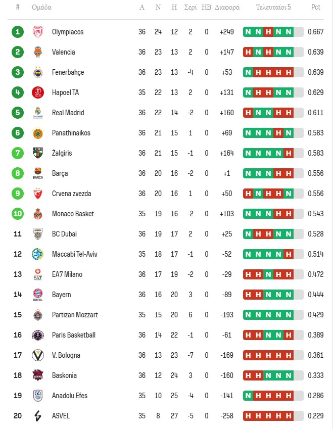 - Ο Ολυμπιακός παραμένει στην κορυφή της Euroleague και εξασφάλισε το πλεονέκτημα έδρας στα playoffs.