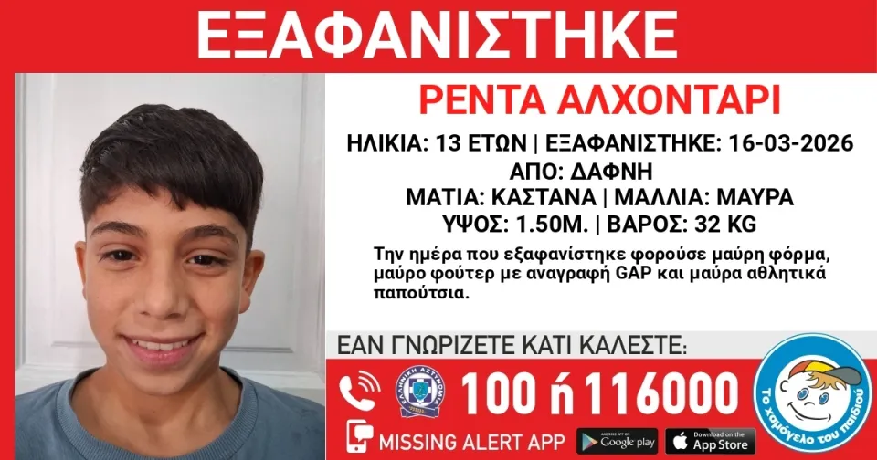 - Ο 13χρονος Ρέντα Αλχονταρί εξαφανίστηκε από χώρο φιλοξενίας ασυνόδευτων ανηλίκων στη Δάφνη.