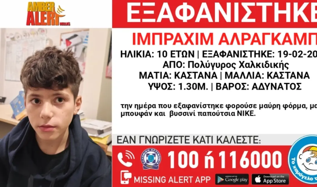 Τον μηχανισμό Amber Alert Hellas ενεργοποίησε κατόπιν εισαγγελικής εντολής «Το Χαμόγελο του Παιδιού» για την εξαφάνιση 10χρονου σήμερα το πρωί από χώρο φιλοξενίας ασυνόδευτων ανηλίκων, στον Πολύγυρο Χαλκιδικής.