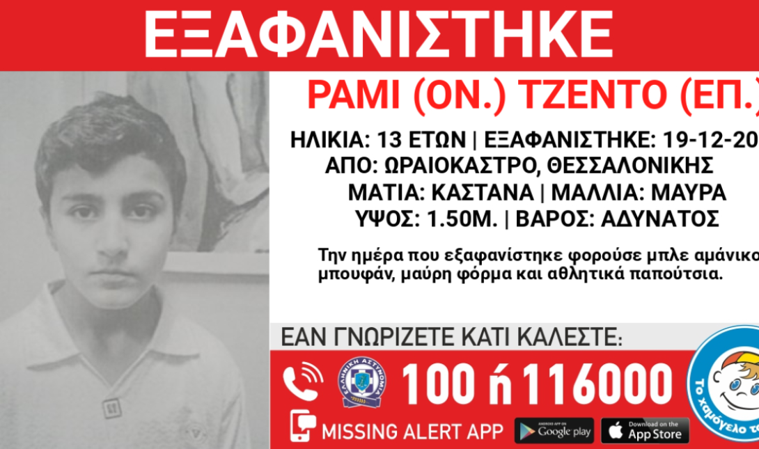 Εξαφανίστηκε σήμερα (19/12) από χώρο φιλοξενίας ασυνόδευτων ανηλίκων στο Ωραιόκαστρο Θεσσαλονίκης ο Τζέντο (επ.) Ραμί (ον.), 13 ετών.