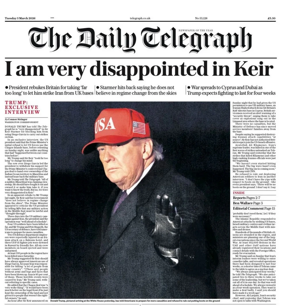 Επιπρόσθετα, η Daily Telegraph κυκλοφόρησε με τον εμφατικό τίτλο «Είμαι πολύ απογοητευμένος από τον Κιρ», φιλοξενώντας αποκλειστικές δηλώσεις του Ντόναλντ Τραμπ. Ο Αμερικανός Πρόεδρος εξαπέλυσε βέλη κατά του Βρετανού Πρωθυπουργού, Κιρ Στάρμερ, με αφορμή την αρχική του άρνηση να επιτρέψει στις αμερικανικές ένοπλες δυνάμεις τη χρήση της στρατηγικής βάσης Ντιέγκο Γκαρσία.