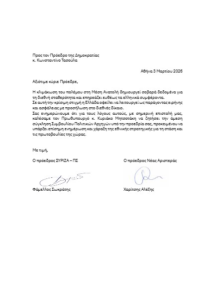 Με επιστολή τους προς τον Πρωθυπουργό, ο Πρόεδρος της Κοινοβουλευτικής Ομάδας του ΣΥΡΙΖΑ-Προοδευτική Συμμαχία Σωκράτης Φάμελλος και ο Πρόεδρος της Κοινοβουλευτικής Ομάδας της Νέας Αριστεράς Αλέξης Χαρίτσης καλούν τον Κ. Μητσοτάκη να ζητήσει από τον Πρόεδρο της Δημοκρατίας την άμεση σύγκληση Συμβουλίου Πολιτικών Αρχηγών.