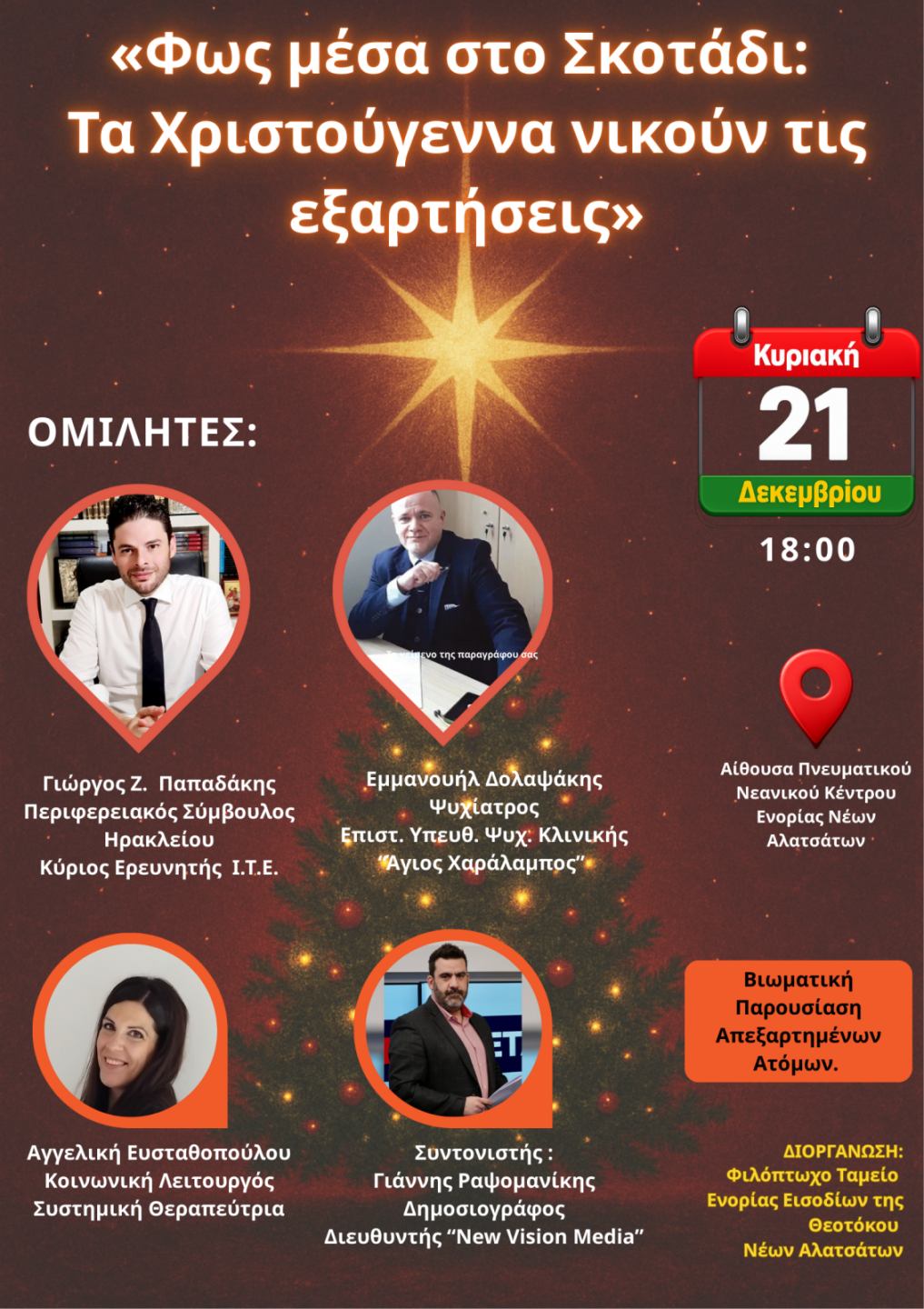 Μια ιδιαίτερα σημαντική εκδήλωση με κοινωνικό και ανθρώπινο χαρακτήρα διοργανώνεται την Κυριακή 21 Δεκεμβρίου 2025, στις 18:00, στην Αίθουσα Πνευματικού Νεανικού Κέντρου της Ενορίας Νέων Αλατσάτων, με τίτλο «Φως μέσα στο Σκοτάδι: Τα Χριστούγεννα νικούν τις εξαρτήσεις».