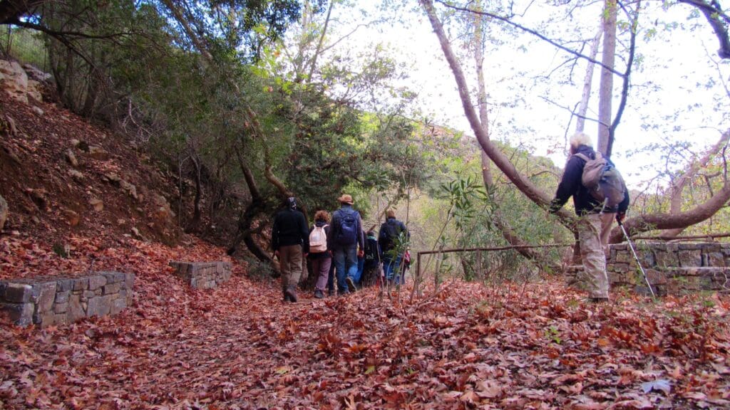 Αφού περιπλανόμαστε λίγο σε χωματόδρομους και κήπους με εσπεριδοειδή, θα εισχωρήσουμε τελικά στο φαράγγι, το οποίο αρχικά είναι καταπράσινο με πικροδάφνες, χαρουπιές, πρίνα, βελανιδιές, σκινόδεντρα, πλατάνια, αστύρακες (Styrax officinalis, συναντάται σε όλη την Κρήτη εκτός απ’ το νομό μας). Η πεζοπορία μας γίνεται από όμορφο μονοπάτι κάτω από τα δέντρα, νοτισμένο από την βραδινή βροχή, που αναδύει τα αρώματα των θάμνων. Τα πεσμένα φύλλα, καθώς και τα πρασινισμένα βρύα στις πέτρες και στους κορμούς των δέντρων, μας θυμίζουν ότι είμαστε σχεδόν στο τέλος του φθινόπωρου. Λίγο πιο μετά αφήνουμε το μονοπάτι και ακολουθούμε την κοίτη του χειμάρρου θαυμάζοντας τα εντυπωσιακά κάθετα τοιχώματα, σκαρφαλώνοντας τους μεγάλους γλιστερούς βράχους με τις λακκούβες τους σε διάφορα σχήματα, ξέχειλες με το νερό της βροχής.