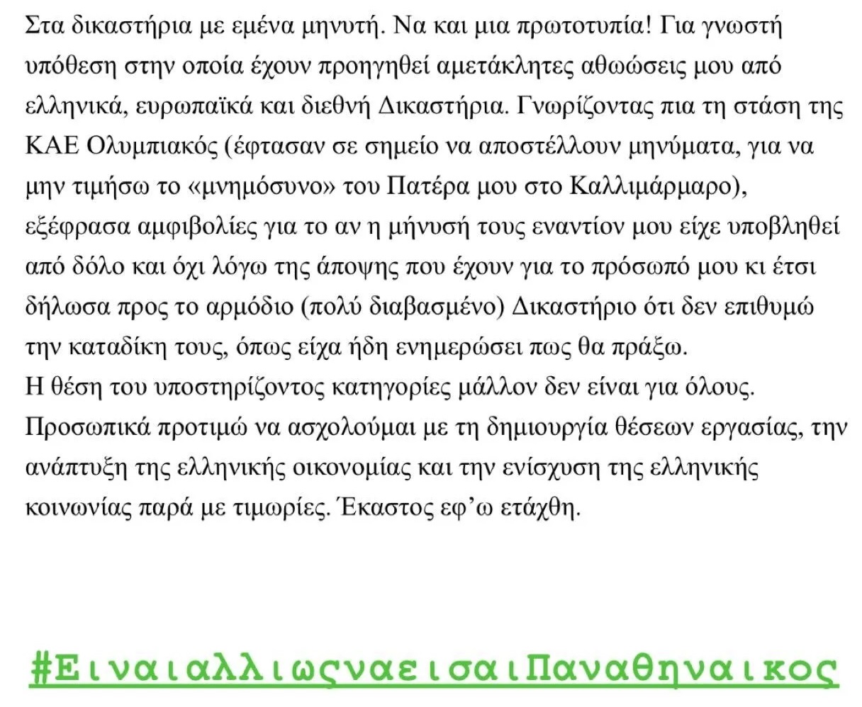 «Στα δικαστήρια με εμένα μηνυτή. Να και μια πρωτοτυπία! Για γνωστή υπόθεση, στην οποία έχουν προηγηθεί αμετάκλητες αθωώσεις μου από ελληνικά, ευρωπαϊκά και διεθνή Δικαστήρια», ανέφερε αρχικά και συνέχισε: «Γνωρίζοντας πλέον τη στάση της ΚΑΕ Ολυμπιακός (έφτασαν στο σημείο να αποστείλουν μηνύματα για να μην τιμήσω το ”μνημόσυνο” του Πατέρα μου στο Καλλιμάρμαρο), εξέφρασα αμφιβολίες για το αν η μήνυσή τους εναντίον μου είχε υποβληθεί από δόλο και όχι λόγω της άποψης που έχουν για το πρόσωπό μου.