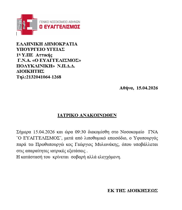 - Ο υφυπουργός παρουσίασε λιποθυμικό επεισόδιο στο Μέγαρο Μαξίμου και μεταφέρθηκε άμεσα στο νοσοκομείο από το ΕΚΑΒ.