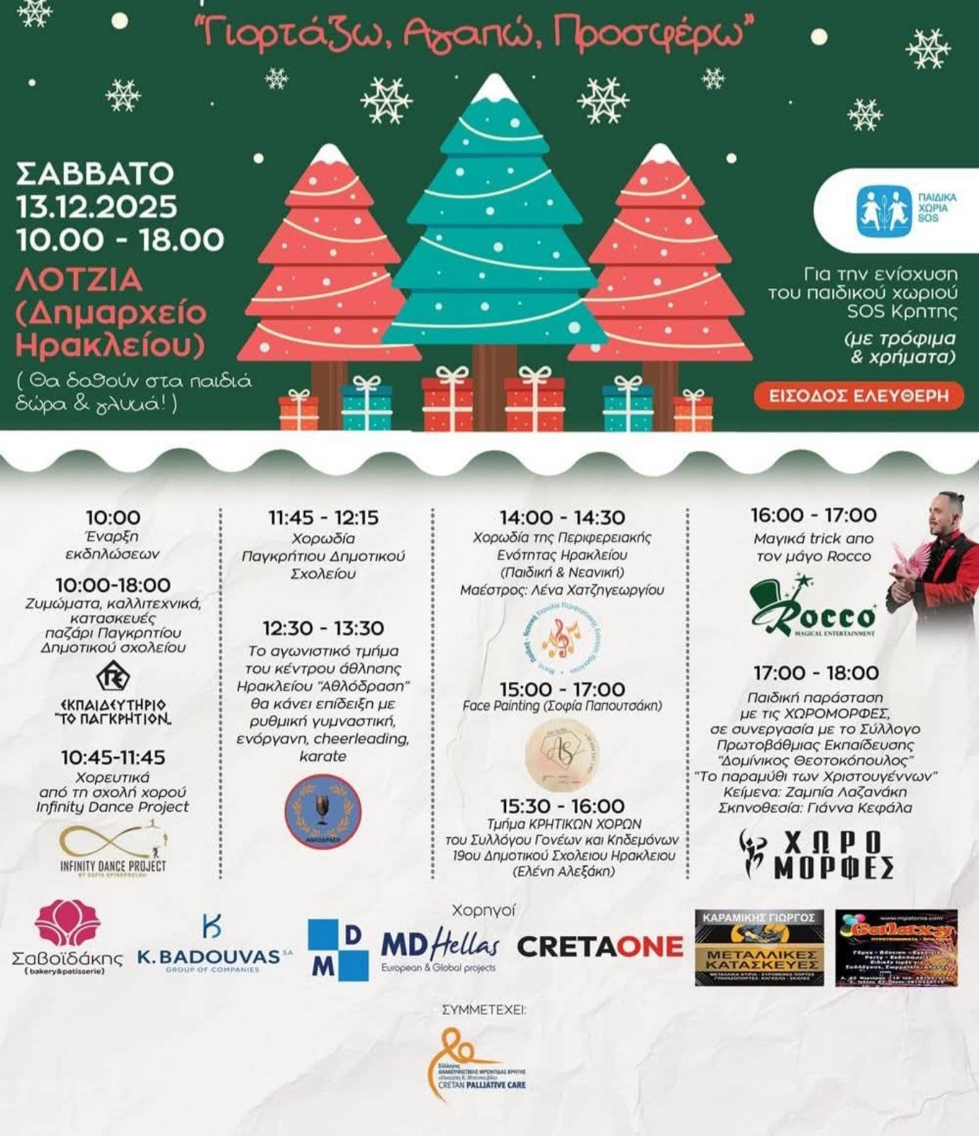 Μια μεγάλη χριστουγεννιάτικη γιορτή αφιερωμένη στα παιδιά και τον εθελοντισμό συνδιοργανώνουν ο Δήμος Ηρακλείου μέσω της Αντιδημαρχίας Εθελοντισμού και η Περιφέρεια Κρήτης το Σάββατο 13 Δεκεμβρίου 2025 από τις 10:00-18:00 στη Λότζια.