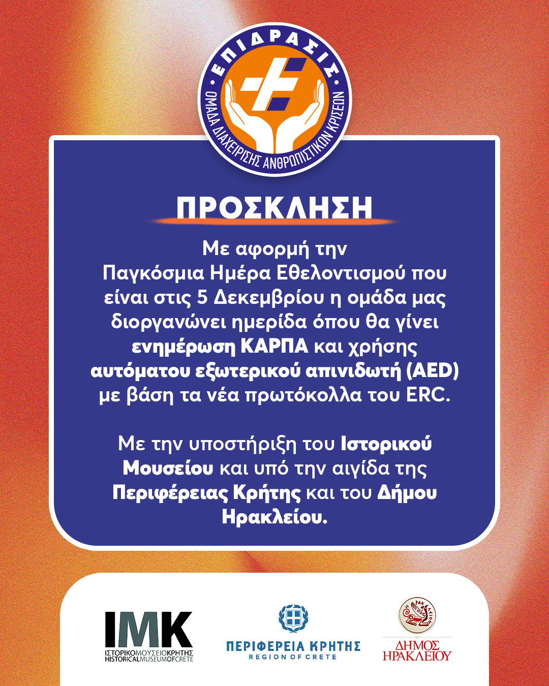 Με αφορμή την Παγκόσμια Ημέρα Εθελοντισμού (5 Δεκεμβρίου), η ομάδα Επίδρασις διοργανώνει φέτος μια ξεχωριστή εκδήλωση που συνδυάζει τον εθελοντισμό, τον πολιτισμό και την εκπαίδευση στις πρώτες βοήθειες. Η δράση, με τίτλο «Εθελοντισμός, Πολιτισμός και Πρώτες Βοήθειες», θα πραγματοποιηθεί στο Ιστορικό Μουσείο Κρήτης το Σάββατο 6 Δεκεμβρίου στις 11:00 π.μ.