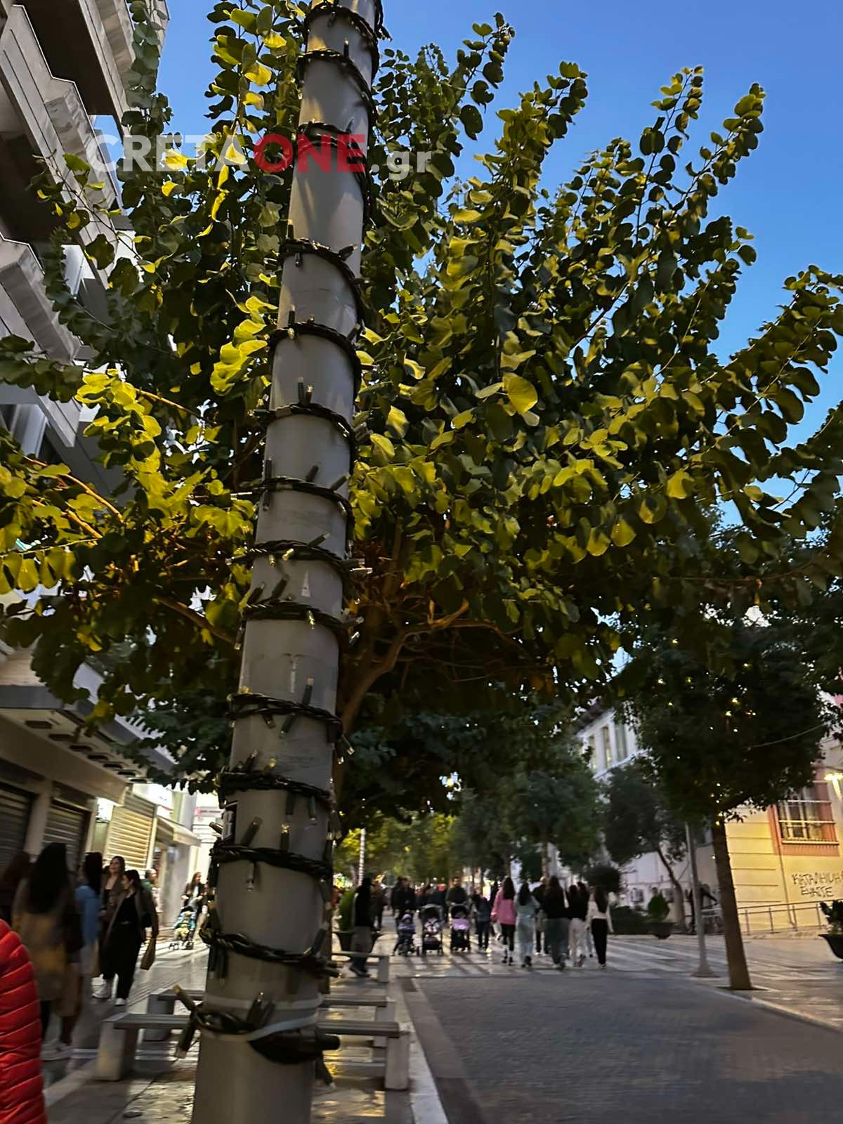 Κι όμως, δύο μόλις ημέρες μετά τη φωταγώγηση, τα φώτα που τοποθετήθηκαν στους κορμούς των δέντρων ήταν κατά τόπους σβηστά.