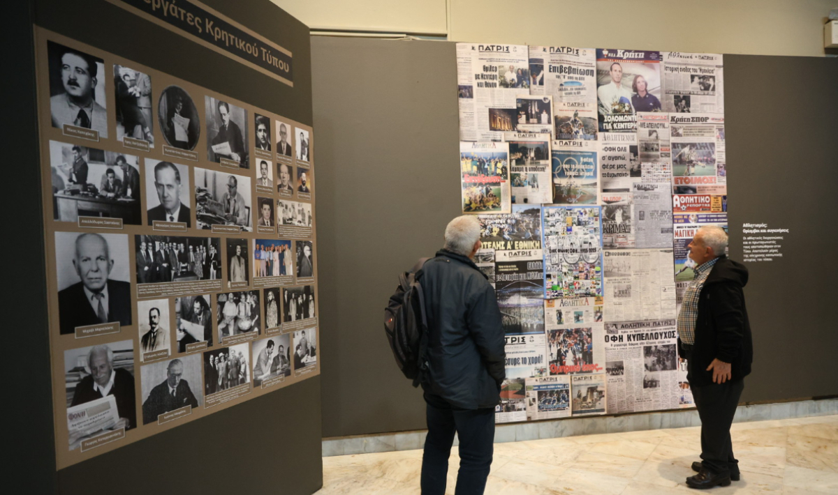 Η έκθεση περιλαμβάνει τεκμήρια και έντυπα του Μουσείου Τύπου της ΕΣΗΕΠΗΝ, το οποίο φέτος συμπληρώνει 70 χρόνιας προσφοράς, και σπάνιο αρχειακό υλικό που παραχώρησαν ευγενικά οι φορείς: Αρχείο της Βουλής των Ελλήνων, Βικελαία Δημοτική Βιβλιοθήκη Ηρακλείου, Ιστορικό Μουσείο Κρήτης, Ιστορικό Αρχείο Κρήτης, Μουσείο Νίκου Καζαντζάκη, αρχείο εφημερίδας «Πατρίς» Ηρακλείου, αρχείο εφημερίδας «Χανιώτικα Νέα», Λαογραφικό Μουσείο Άνω Βιάννου, Οργανισμός Πολιτισμού και Ανάπτυξης Ποταμιών «Η Γκουβερνιώτισσα».