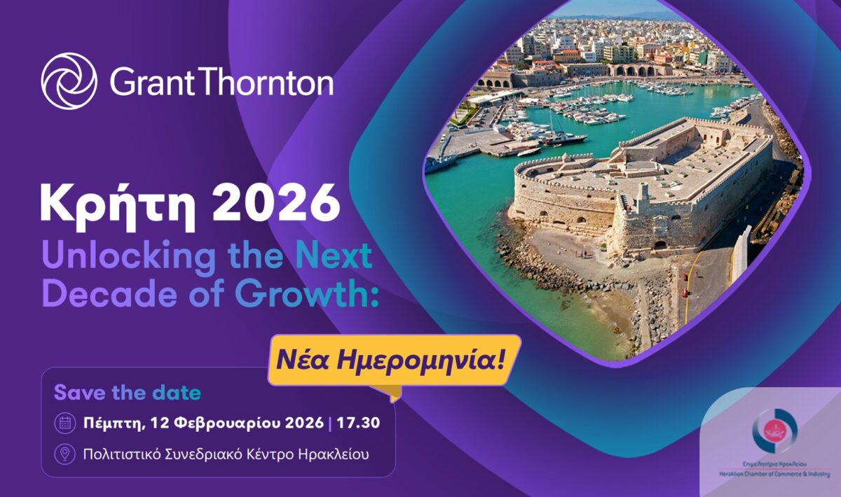 Με νέα ημερομηνία στις 12 Φεβρουαρίου 2026 και ώρα 17:30 θα πραγματοποιηθεί η εκδήλωση της Grant Thornton με τίτλο “Unlocking the Next Decade of Growth: Embracing Technology, Investment, and Global Expansion“, υπό την αιγίδα του Εμπορικού και Βιομηχανικού Επιμελητηρίου Ηρακλείου, στο Πολιτιστικό Συνεδριακό Κέντρο Ηρακλείου.
