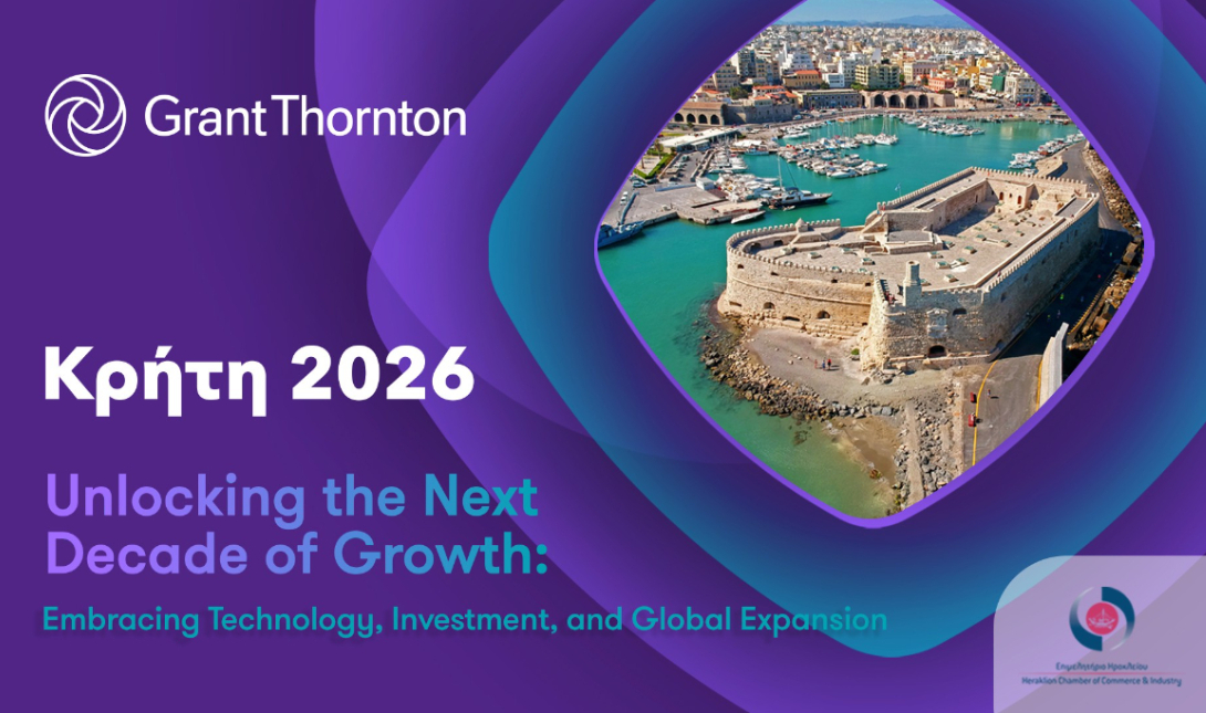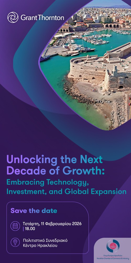 Η Grant Thornton διοργανώνει στις 11 Φεβρουαρίου 2026 στο Πολιτιστικό Συνεδριακό Κέντρο Ηρακλείου, την εκδήλωση με τίτλο “Unlocking the Next Decade of Growth: Embracing Technology, Investment, and Global Expansion” υπό την αιγίδα του Εμπορικού και Βιομηχανικού Επιμελητηρίου Ηρακλείου, που φιλοδοξεί να αποτελέσει σημείο αναφοράς για τον στρατηγικό διάλογο γύρω από το μέλλον της ελληνικής οικονομίας και του επιχειρείν στην Κρήτη.