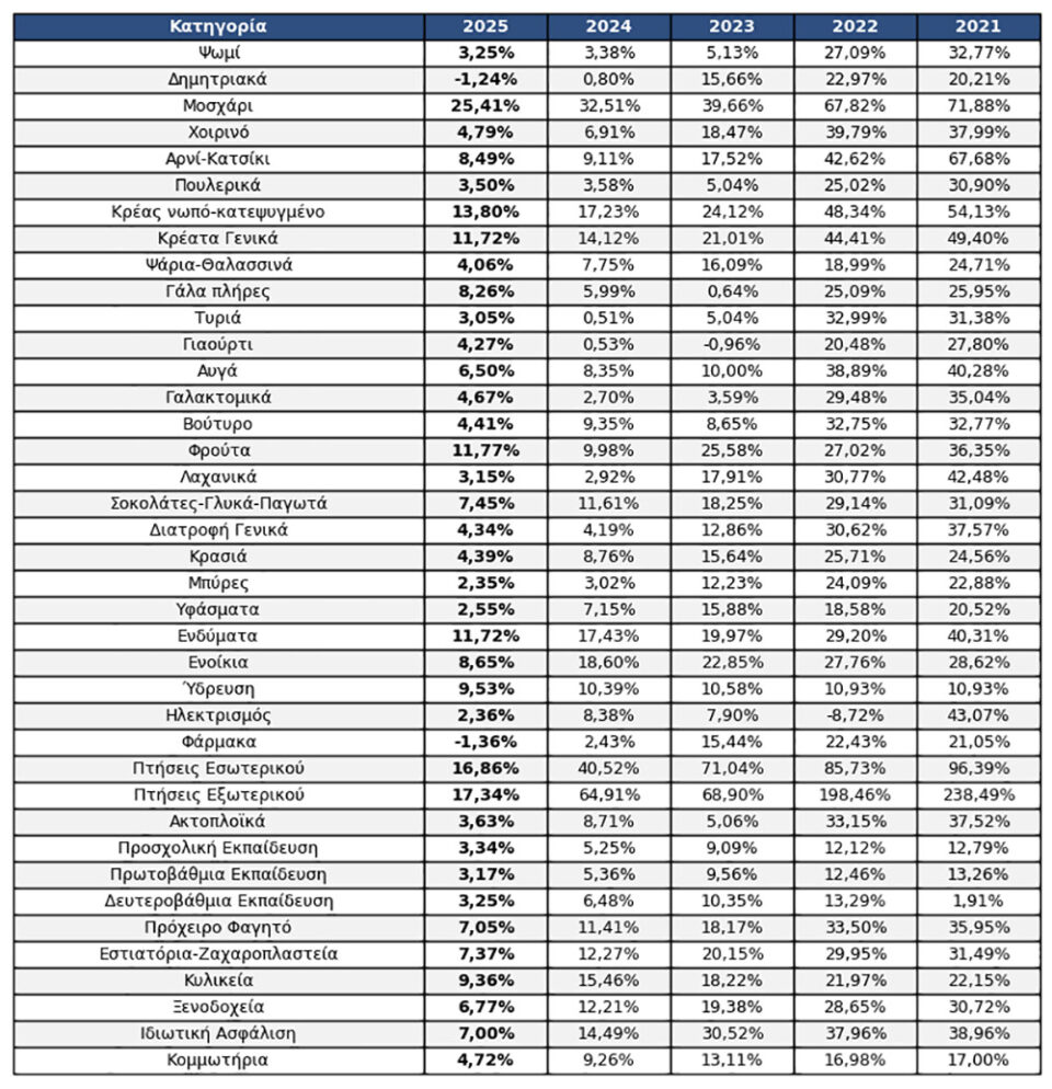 Η λίστα της εγκυκλίου του Γενικού Γραμματέα Εμπορίου δείχνει το μέγεθος του προβλήματος. Σε πολλές περιπτώσεις οι αυξήσεις από το 2021 έως το 2025 είναι μεσοσταθμικά τριπλάσιες (ή και παραπάνω σε ορισμένες περιπτώσεις) του Δείκτη Τιμών Καταναλωτή.