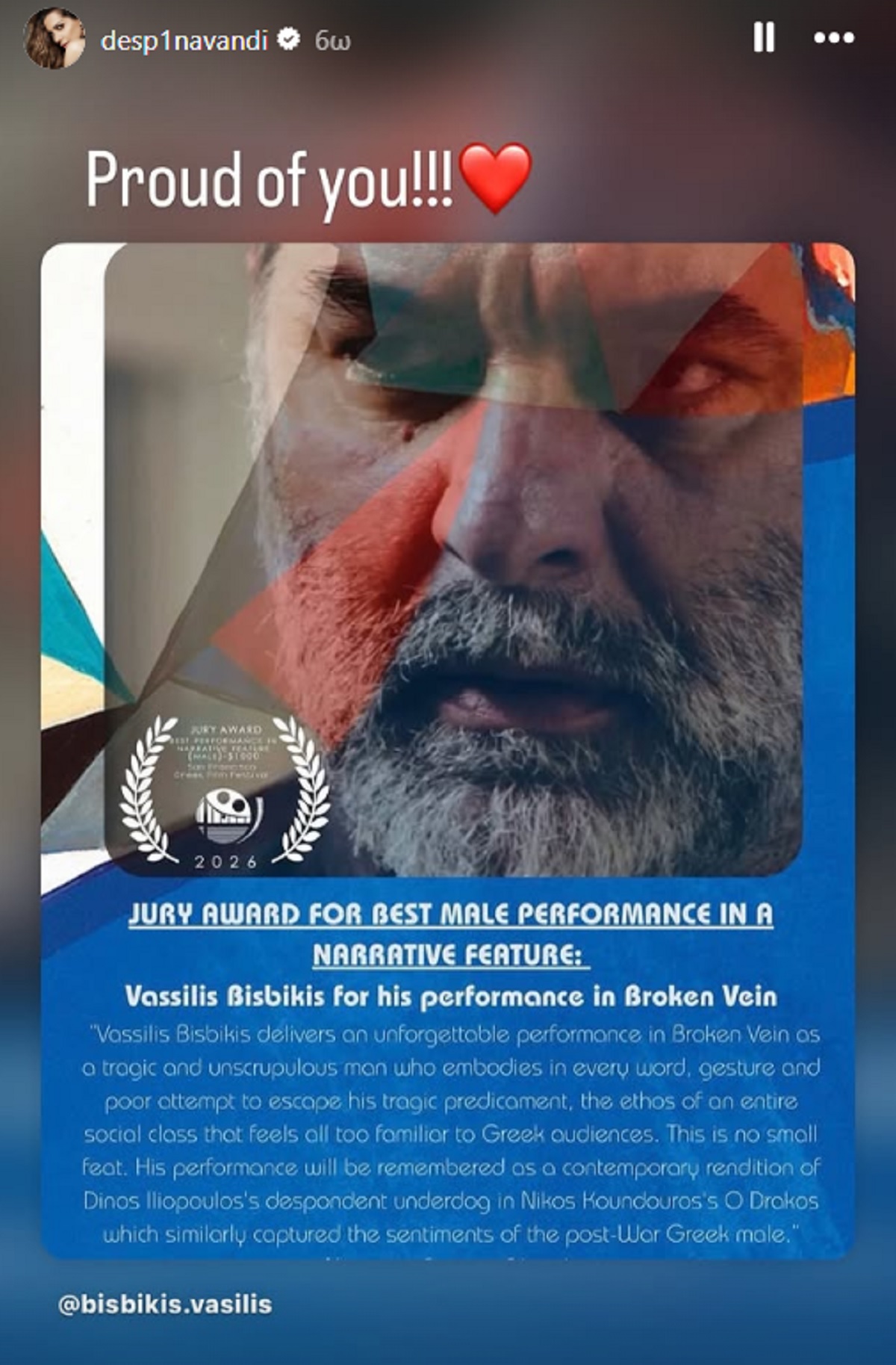 Η ταινία του Γιάννη Οικονομίδη, Σπασμένη Φλέβα απέσπασε το βραβείο Καλύτερης Ταινίας Μυθοπλασίας στο San Francisco Greek Film Festival 2026. Ενώ ο Βασίλης Μπισμπίκης τιμήθηκε με το βραβείο Καλύτερης Ανδρικής Ερμηνείας. Η Δέσποινα Βανδή έδωσε δημόσια τα συγχαρητήριά της στον σύντροφό της με μια ανάρτηση στον λογαριασμό της στο Instagram.