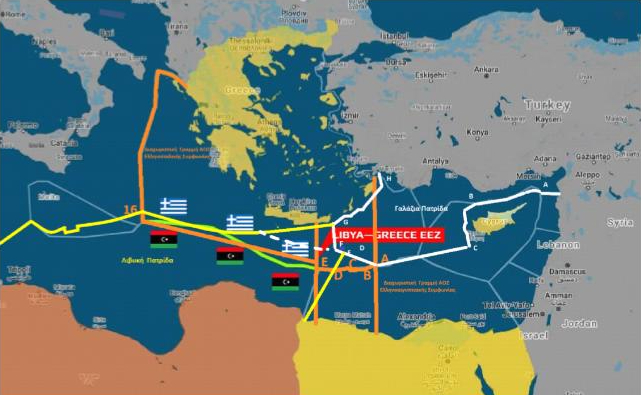 Πηγή: Εικόνα της Σεβίλλης, με επεξεργασία της από τους Συγγραφείς, Κίτρινη γραμμή η “Λιβυκή ΑΟΖ” ,Άσπρη γραμμή, η “Γαλάζια πατρίδα”, και πορτοκαλί, η Ελληνική ΑΟΖ.